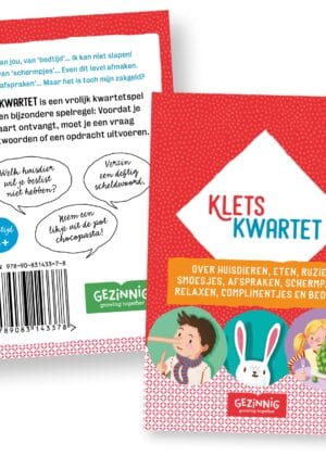 Kletskwartet is een vrolijk kwartetspel over huisdieren, eten, ruzie, smoesjes, afspraken, schermpjes, relaxen, complimentjes en bedtijd.
