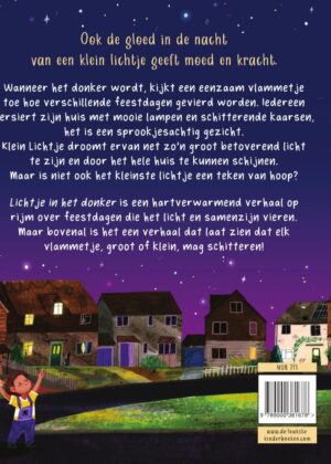 Lichtje in het donker is een verhaal over een dorp en de feestdagen die in de verschillende huizen gevierd worden. Klein Lichtje, een nietig en verlegen vlammetje, is onder de indruk van hoe de andere vlammetjes de huizen als schitterende versiering doen oplichten. Klein Lichtje droomt ervan net zo’n grote vlam te zijn en door het hele huis te kunnen schijnen. Maar is niet ook het kleinste lichtje een teken van hoop?