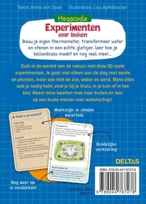 In deze leuke doos van Deltas zitten maar liefst 50 kaarten vol supercoole experimenten. Duik in de wereld van de natuur en ga niet alleen aan de slag met aarde en planten, maar ook met de zon, water en wind. Bijna alles wat je nodig hebt, vind je bij je thuis, in je tuin of in het bos. Neem deze kaarten mee naar buiten en leer op een leuke manier over wetenschap!