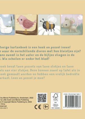 Dit stevige kartonboek is een boek en puzzel ineen! Zie je waar de verschillende dieren met hun kleintjes zijn? De gans zwemt in het water, de bijtjes vliegen in de lucht. Wie spelen er in het gras?