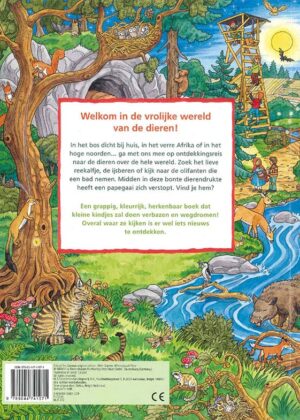 In het bos dicht bij huis, in het verre Afrika of in het hoge noorden… ga met ons mee op ontdekkingsreis naar de dieren over de hele wereld. Zoek het lieve reekalfje, de ijsberen of kijk naar de olifanten die een bad nemen. Midden in deze bonte dierendrukte heeft een papegaai zich verstopt. Vind je hem?