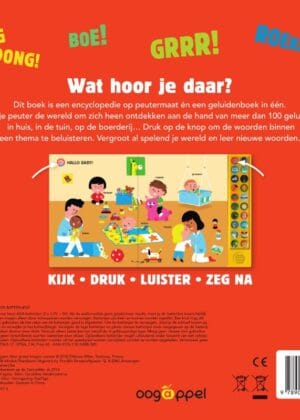 Dit boek is een encyclopedie op peutermaat én een geluidenboek in één.Laat je peuter de wereld om zich heen ontdekken aan de hand van meer dan 100 geluiden: in huis, in de tuin, op de boerderij… Druk op de knop om de woorden binnen een thema te beluisteren. Vergroot al spelend je wereld en leer nieuwe woorden.