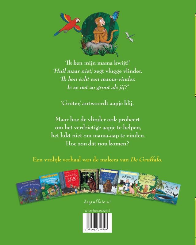 Maar hoe de vlinder ook probeert om het verdrietige aapje te helpen, het lukt niet om mama-aap te vinden. Hoe zou dát nou komen?