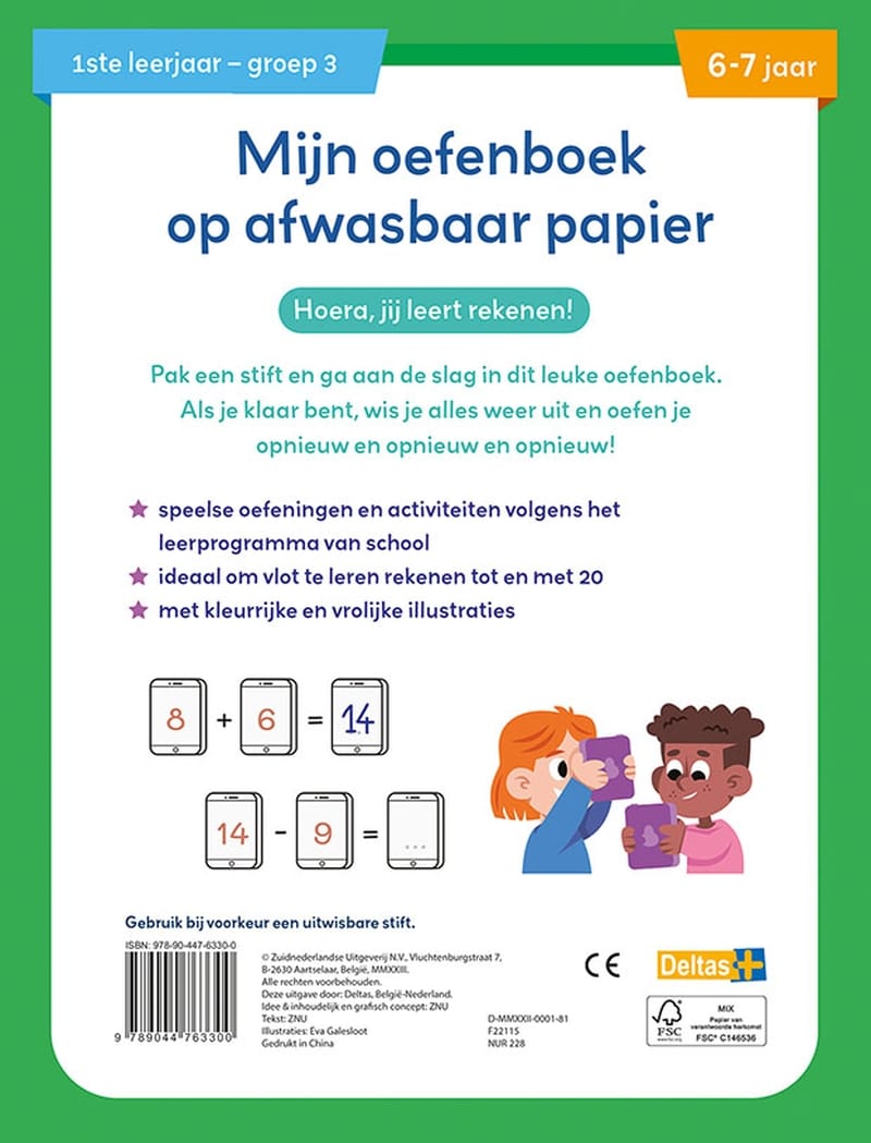 Dit leuke oefenboek op afwasbaar papier is herbruikbaar en dus ideaal voor kinderen die de sommen van op school willen oefenen. Laat je kind met een stift de oefeningen oplossen, uitwissen en opnieuw beginnen. Eindeloos oefenplezier verzekerd! Voor kinderen van 6 tot 7 jaar die willen leren rekenen TIP: Gebruik bij voorkeur een uitwisbare stift.
