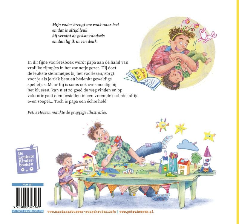 Mijn papa is een held! is een fijn voorleesboek op rijm voor kleuters vanaf 4 jaar. Petra Heezen maakte de grappige illustraties.