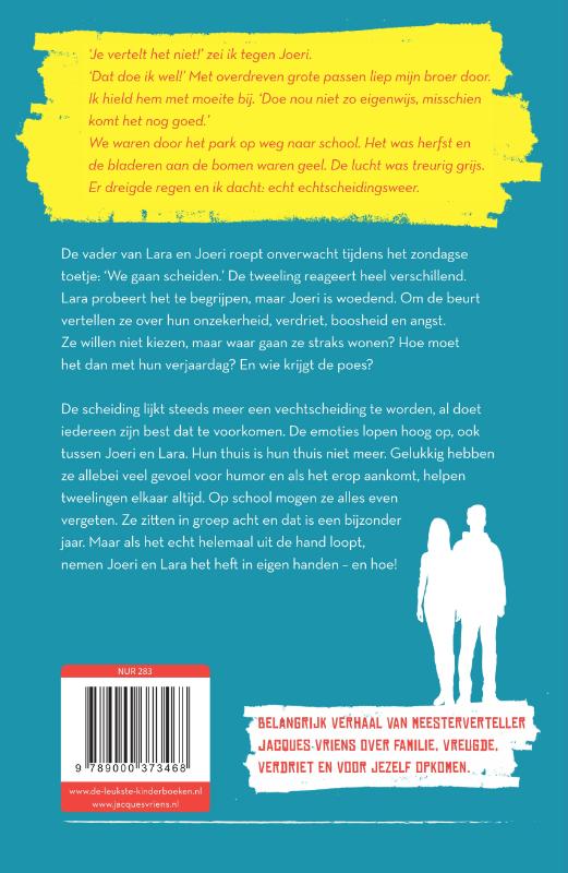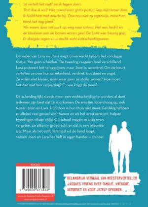 De scheiding lijkt steeds meer een vechtscheiding te worden, al doet iedereen zijn best dat te voorkomen. De emoties lopen hoog op, ook tussen Joeri en Lara. Hun thuis is hun thuis niet meer. Gelukkig hebben ze allebei veel gevoel voor humor en als het erop aankomt, helpen tweelingen elkaar altijd. Op school mogen ze alles even vergeten. Ze zitten in groep acht en dat is een bijzonder jaar. Maar als het echt helemaal uit de hand loopt, nemen Joeri en Lara het heft in eigen handen – en hoe!