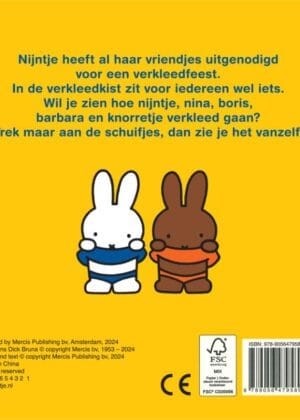 Nijntje heeft haar vriendjes uitgenodigd voor een verkleedfeest. Er is een verkleedkist met voor iedereen iets. Wil je zien hoe nijntje, nina, boris, barbara en knorretje verkleed gaan? Trek maar aan de schuifjes, dan zie je het vanzelf!