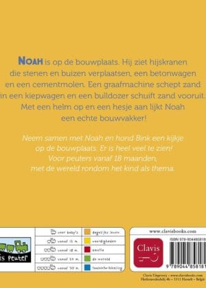 Noah is op de bouwplaats. Hij ziet hijskranen die stenen en buizen verplaatsen, een betonwagen en een cementmolen. Een graafmachine schept zand in een kiepwagen en een bulldozer schuift zand vooruit. Met een helm op en een hesje aan lijkt Noah een echte bouwvakker!