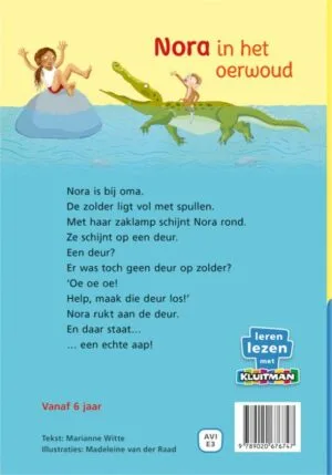 Nora mag van oma op zolder spelen. Maar net als ze een leuk boek wil gaan lezen, hoort ze een vreemd geluid. Het komt van achter de deur. De deur? Er is helemaal geen deur op zolder! Als Nora hem opent, staat ze oog in oog met mama aap, die haar kleintje kwijt is. Voor ze het weet, slingert Nora rond in het oerwoud en moet ze een krokodil te slim af zijn om het kleine aapje te redden.