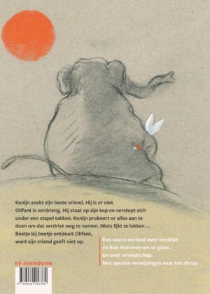 Olifant is verdrietig. Hij staat op zijn kop en verstopt zich onder een stapel takken. Konijn probeert er alles aan te doen om dat verdriet weg te nemen. Hij jongleert, schommelt op de trapeze, fietst op één wiel, tuimelt op en neer. Niets lijkt te lukken … Maar Konijn geeft niet op! Misschien helpt het wel als hij zelf ondersteboven gaat staan?