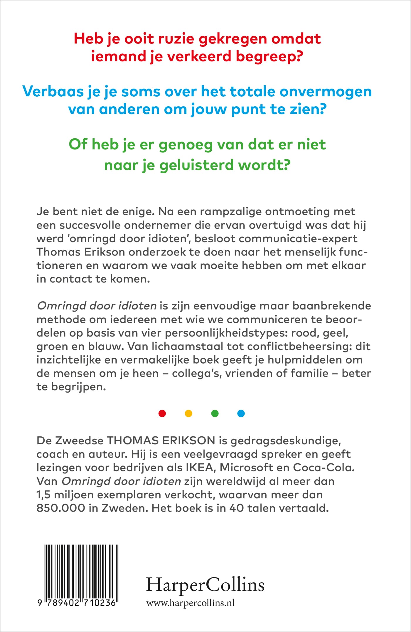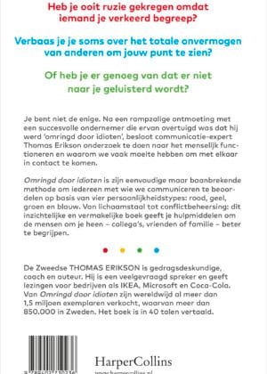 Welke gedragsstijl is de jouwe? Drijf je collega je tot waanzin met zijn overdreven liefde voor details? Botst het gematigde karakter van je geliefde met je eigen enthousiasme? Sommige mensen beweren dat zij omringd worden door idioten. Zij begrijpen hun collega’s of familie niet, hoe ze ook hun best doen. Als je echter meer inzicht hebt in het gedrag van de ander, en dat van jezelf, kun je beter met de ander communiceren. Een veelgebruikte methode daarvoor is het aanduiden van gedragsstijlen met kleuren. Ben je bijvoorbeeld rood, dan wil je snel tot de kern van de zaak komen. Heb je voornamelijk gele kanten, dan ben je snel enthousiast, groen staat voor stabiliteit en blauwe eigenschappen hebben te maken met informatie en details. Thomas Erikson leert je om op praktische en eenvoudige wijze dit kleurenschema toe te passen. Omringd door idioten helpt je collega’s, vrienden en familie beter te begrijpen.