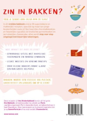 In dit vrolijke bakboek vind je 30 superlekkere en makkelijke recepten, speciaal op maat van jonge keukenhelden zoals jij! Van heerlijke chocoladekoekjes en feestelijke cupcakes tot knallende pannenkoeken en verrukkelijke cheesecake: alles wordt stap voor stap uitgelegd met kleurrijke tekeningen van Evelien Jacobs (@evelontwerpt).