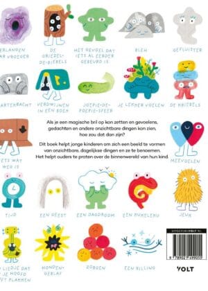 Dit boek helpt jonge kinderen om zich een beeld te vormen van onzichtbare, dagelijkse dingen en ze te benoemen: een vieze geur, de smaak van broccoli, een angstig gevoel. Het helpt ouders te praten over de binnenwereld van een kind.