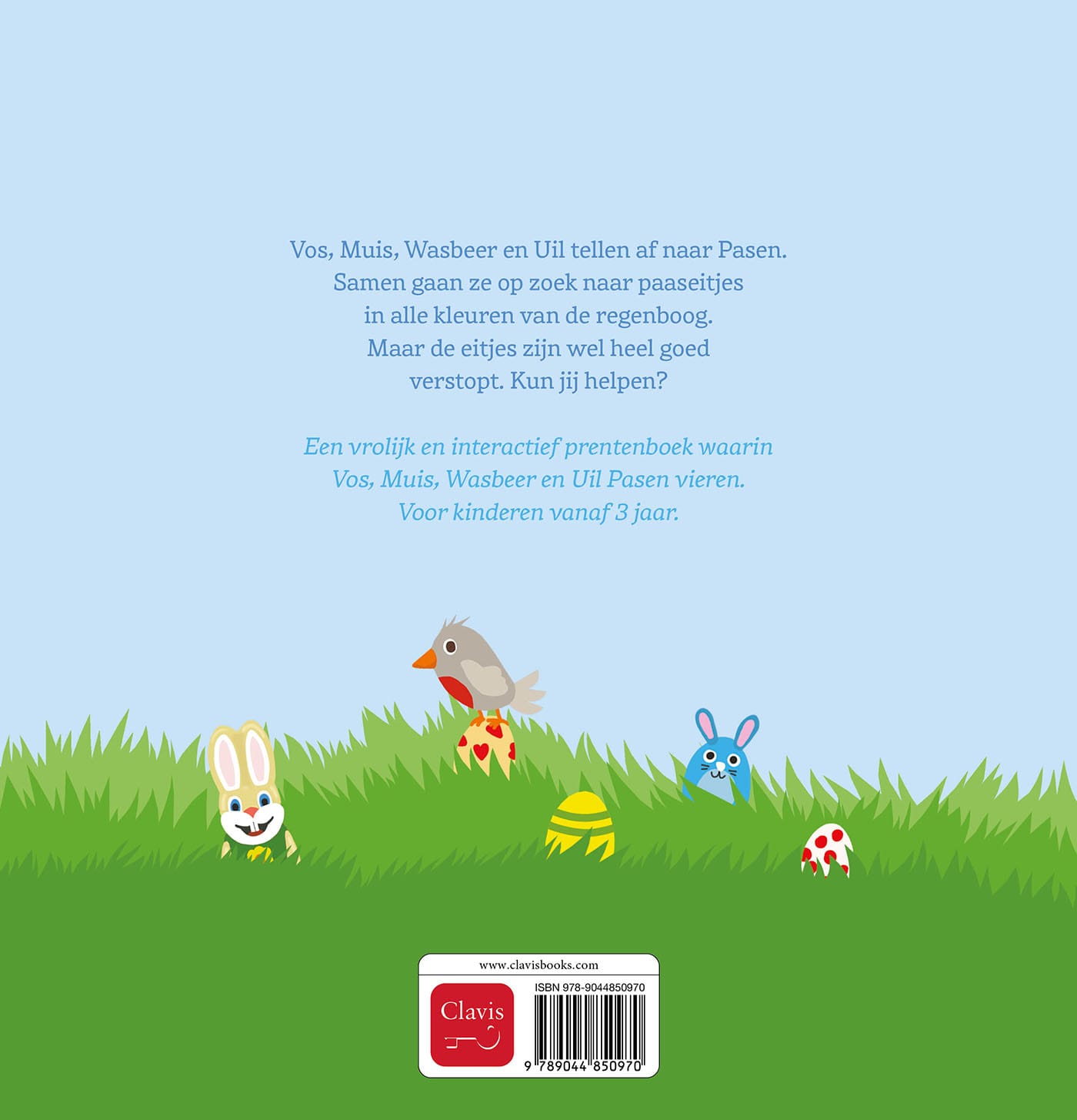Vos, Muis, Wasbeer en Uil tellen af naar Pasen. Samen gaan ze op zoek naar paaseitjes in alle kleuren van de regenboog. Maar de eitjes zijn wel heel goed verstopt. Kun jij helpen?