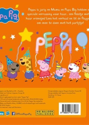 Het is feest, want ‘Peppa Pig’ is jarig in ‘Peppa’s verrassingsfeestje’! Dit interactieve prentenboek met flapjes barst van de vrolijkheid en maakt voorlezen nóg leuker. Mama en Papa Big hebben een speciale verrassing voor Peppa in petto: een feestje met ál haar vriendjes. Peppa staat in het middelpunt van belangstelling en jij kunt samen met haar alle verjaardagsverrassingen ontdekken.