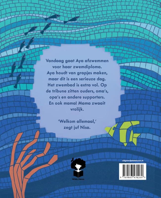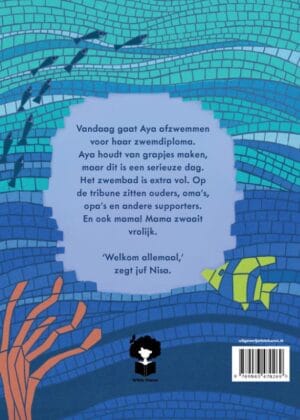 Vandaag gaat Aya afzwemmen voor haar zwemdiploma. Aya houdt van grapjes maken, maar dit is een serieuze dag. Het zwembad is extra vol. Op de tribune zitten ouders, oma’s, opa’s en andere supporters. En ook mama! Mama zwaait vrolijk. ‘Welkom allemaal, zegt juf Nisa.