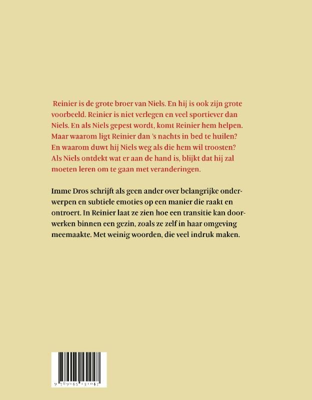 Imme Dros schrijf als geen ander over belangrijke onderwerpen en subtiele emoties op een manier die raakt en ontroert. In Reinier laat ze zien hoe een transitie kan doorwerken binnen een gezin, zoals ze zelf in haar omgeving meemaakte. Met weinig woorden, die veel indruk maken.
