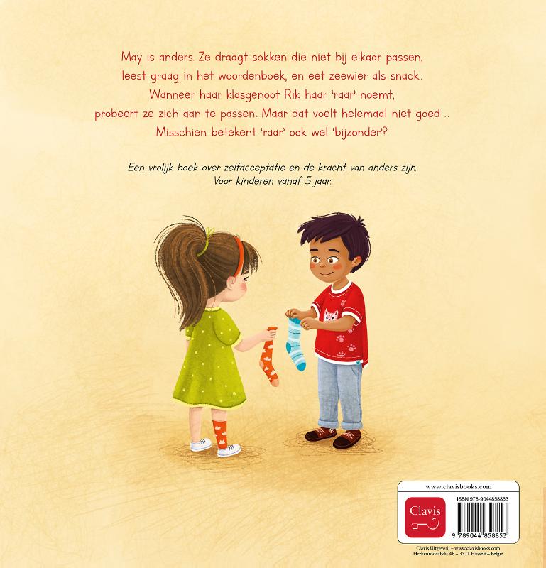 May is anders. Ze draagt sokken die niet bij elkaar passen, leest graag in het woordenboek, en eet zeewier als snack. Wanneer haar klasgenoot Rik haar ‘raar’ noemt, probeert ze zich aan te passen. Maar dat voelt helemaal niet goed … Misschien betekent ‘raar’ ook wel ‘bijzonder’?