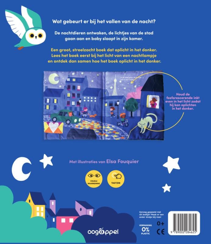 Een groot, streelzacht boek dat oplicht in het donker.Lees het boek eerst bij het licht van een nachtlampje en ontdek dan samen hoe het boek oplicht in het donker.
