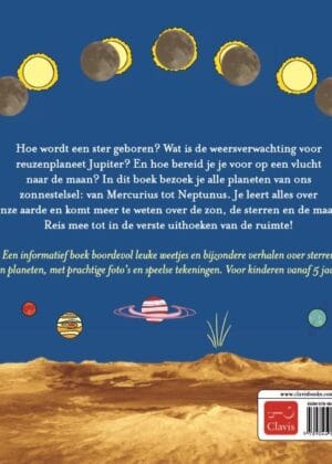 Een informatief boek boordevol leuke weetjes en bijzondere verhalen over sterren en planeten, met prachtige foto’s en speelse tekeningen. Voor kinderen vanaf 5 jaar