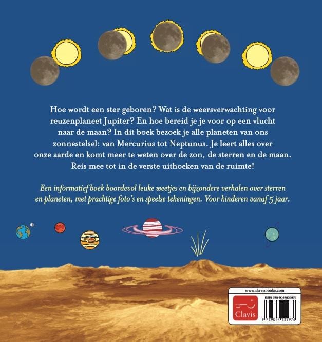 Hoe wordt een ster geboren? Wat is de weersverwachting voor reuzenplaneet Jupiter? En hoe bereid je je voor op een vlucht naar de maan? In dit boek bezoek je alle planeten van ons zonnestelsel: van Mercurius tot Neptunus. Je leert alles over onze aarde en komt meer te weten over de zon, de sterren en de maan. Reis mee tot in de verste uithoeken van de ruimte!