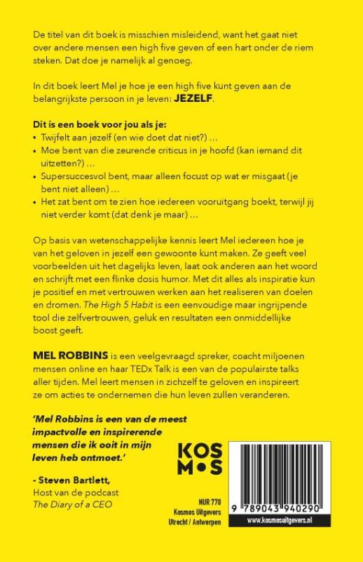 Op basis van wetenschappelijke kennis leert Mel iedereen hoe je van het geloven in jezelf een gewoonte kunt maken. Ze geeft veel voorbeelden uit het dagelijks leven, laat ook anderen aan het woord en schrijft met een flinke dosis humor. Met dit alles als inspiratie kun je positief en met vertrouwen werken aan het realiseren van doelen en dromen. The High 5 Habit is een eenvoudige maar ingrijpende tool de zelfvertrouwen, geluk en resultaten en resultaten een onmiddelijke boost geeft.