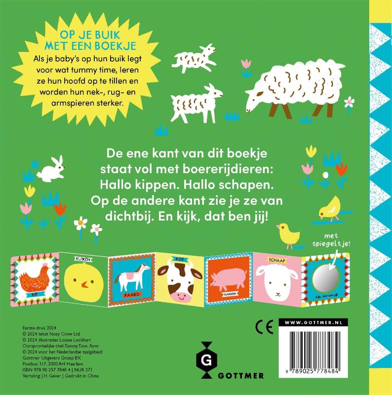 Het kleurrijke en interactieve boekje ‘Tummy Time Boerderij’, van de bekende Britse ontwerper Louise Lockhart, is een ideaal hulpmiddel voor buiktijd of ’tummy time’. Dit boekje, speciaal ontworpen voor baby’s, kan als een harmonica worden uitgevouwen, plat op de vloer gelegd worden of rechtop in de box worden gezet. Hierdoor is het een perfect instrument voor buiktijd of ’tummy time’, waarbij baby’s als ze wakker zijn op hun buik liggen om hun armen, rug en nekspieren te versterken, zoals wordt aanbevolen door experts van het consultatiebureau.