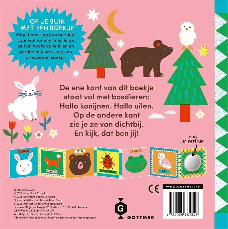 Het kleurrijke en interactieve babyboekje ‘Tummy Time in het bos’ is een ideaal hulpmiddel voor buiktijd of ’tummy time’. Dit boekje is speciaal ontworpen voor baby’s en kan als een harmonica worden uitgevouwen, plat op de vloer gelegd worden of rechtop in de box worden gezet. Hierdoor is het een perfect instrument voor tummy time, waarbij baby’s als ze wakker zijn op hun buik liggen om hun armen, rug en nekspieren te versterken, zoals wordt aanbevolen door experts van het consultatiebureau. De felle kleuren van het bos en de dierengezichten stimuleren het gezichtsvermogen en op die manier houden de vrolijke illustraties van Louise Lockhart zelfs de aandacht van de meest beweeglijke baby’s vast.