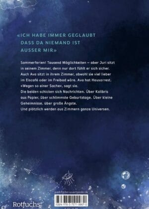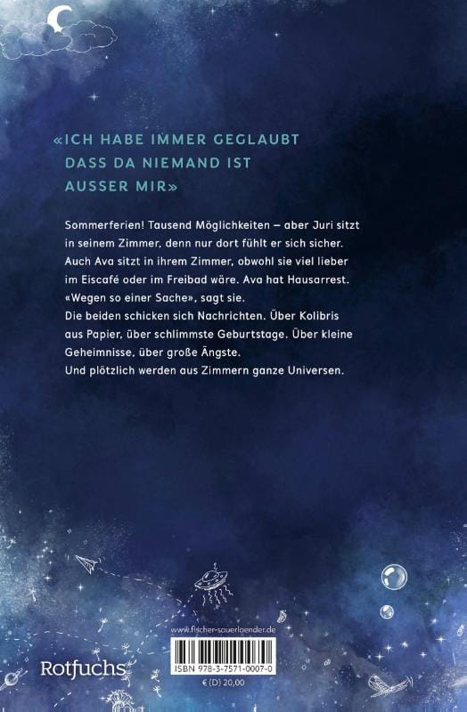 Sommerferien! Alle Menschen sind draußen, sitzen im Eiscafé oder liegen am Badesee. Nur der vierzehnjährige Juri bleibt zu Hause, denn Juris Lieblingsort ist sein Zimmer – hier fühlt er sich sicher. Knapp zwei Wochen vor Schulbeginn erhält er eine Nachricht von Ava. Die beiden kennen sich aus der Grundschule, seit Jahren haben sie nichts voneinander gehört. Ava würde liebend gern mit anderen Menschen im Freibad sein. Doch Ava hat Hausarrest. «Wegen so einer Sache», sagt sie. Obwohl die beiden unterschiedlicher nicht sein könnten, folgen auf Text- und Sprachnachrichten über Joghurteis mit Himbeersauce und schlimmste Geburtstage schon bald erste Geständnisse. Über kleine Geheimnisse und große Ängste. Bis Avas wilde Geschichten das gerade erst gewonnene Vertrauen ins Wanken bringen.