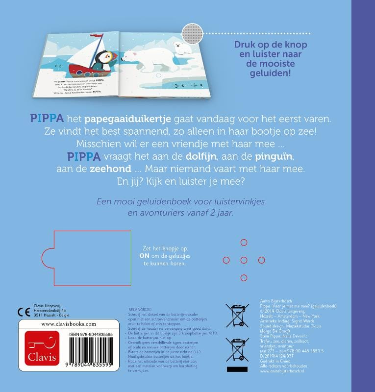 Pippa de papegaaiduiker is gek op varen. Wie wil er met haar mee? Pippa vraagt het aan de ijsbeer, de walvis, de pinguïns … maar niemand wil met haar mee. En jij? Kijk, zoek en luister je mee?