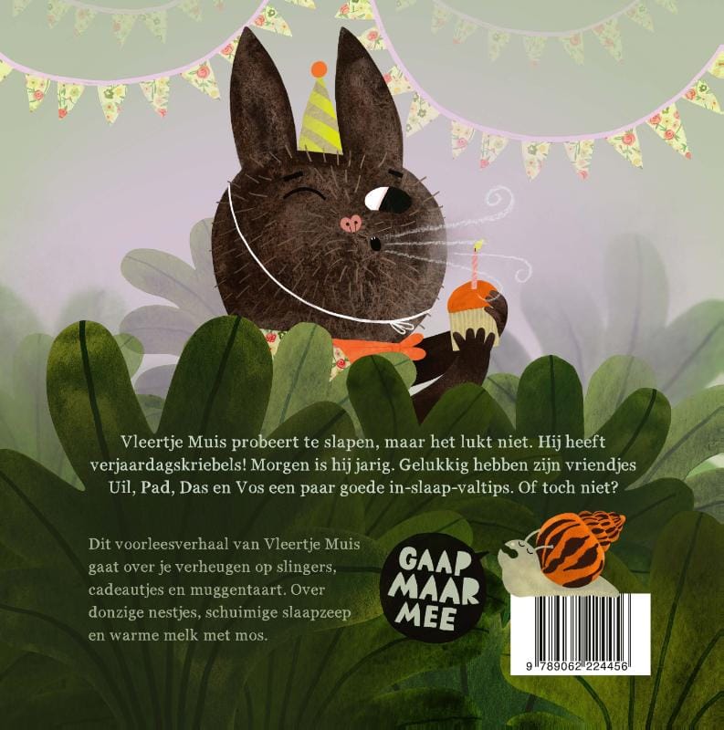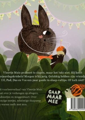 Vleertje Muis probeert te slapen, maar het lukt niet. Hij heeft verjaardagskriebels! Morgen is hij jarig. Gelukkig hebben zijn vriendjes Uil, Pad, Das en Vos een paar goede in-slaap-val-tips. Of toch niet?