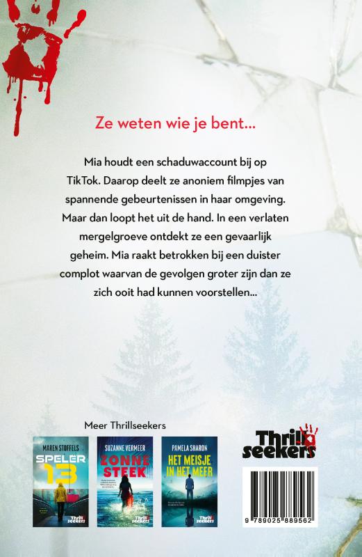 In Volg me, het nieuwe boek binnen de Thrillseekers-reeks, geschreven door veelgeprezen thrillauteur Shanna de Jong, houdt Mia een schaduwaccount bij op TikTok. Daarop deelt ze anoniem filmpjes van spannende gebeurtenissen in haar omgeving. Maar dan loopt het uit de hand. In een verlaten mergelgroeve ontdekt ze een gevaarlijk geheim. Mia raakt betrokken bij een duister complot waarvan de gevolgen groter zijn dan ze zich ooit had kunnen voorstellen…