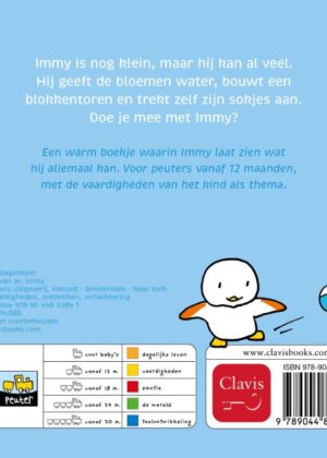 Een warm boekje waarin Immy laat zien wat hij allemaal kan. Voor peuters vanaf 12 maanden, met de vaardigheden van het kind als thema.