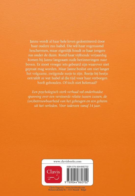 Een psychologisch sterk verhaal vol onderhuidse spanning over een verstoorde relatie tussen zussen, de (on)betrouwbaarheid van het geheugen en een geheim uit het verleden. Voor iedereen vanaf 14 jaar.