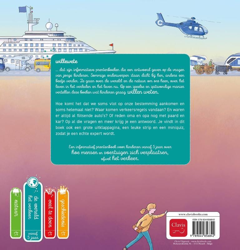 Hoe komt het dat we soms vlot op onze bestemming aankomen en soms helemaal niet? Waar komen verkeersregels vandaan? En waren er altijd al flitsende auto’s? Of reden oma en opa nog met paard en kar? Op al die vragen en meer krijg je een antwoord. Je vindt in dit boek ook een grote uitklappagina, een leuke strip en een miniquiz, zodat je een echte expert wordt.
