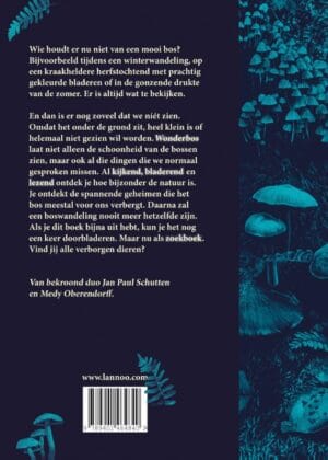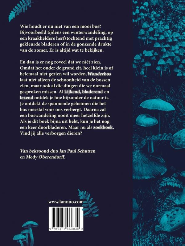 En dan is er nog zoveel dat we níét zien. Omdat het onder de grond zit, heel klein is of helemaal niet gezien wil worden. Wonderbos laat niet alleen de schoonheid van de bossen zien, maar ook al die dingen die we normaal gesproken missen. Al kijkend, bladerend en lezend ontdek je hoe bijzonder de natuur is. Je ontdekt de spannende geheimen die het bos meestal voor ons verbergt. Daarna zal een boswandeling nooit meer hetzelfde zijn. Als je het bijna uit hebt, kun je het nog een keer doorbladeren. Maar nu als zoekboek. Vind jij alle verborgen dieren?